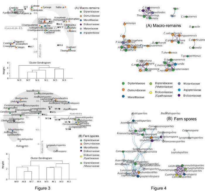 左图为真蕨植物大化石和蕨类孢子的聚类分析及主成分分析;右图为基于共生关系分析的蕨类大植物化石及蕨类孢子共存网络图。