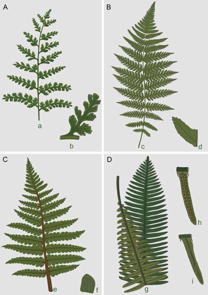 A. 网叶蕨(Dictyophyllum nilssoni);B. 合囊蕨(Marattia muensteri); C. 荷叶蕨(Hausmannia emeiensis);D. 拟丹尼蕨(Danaeopsis fecunda)