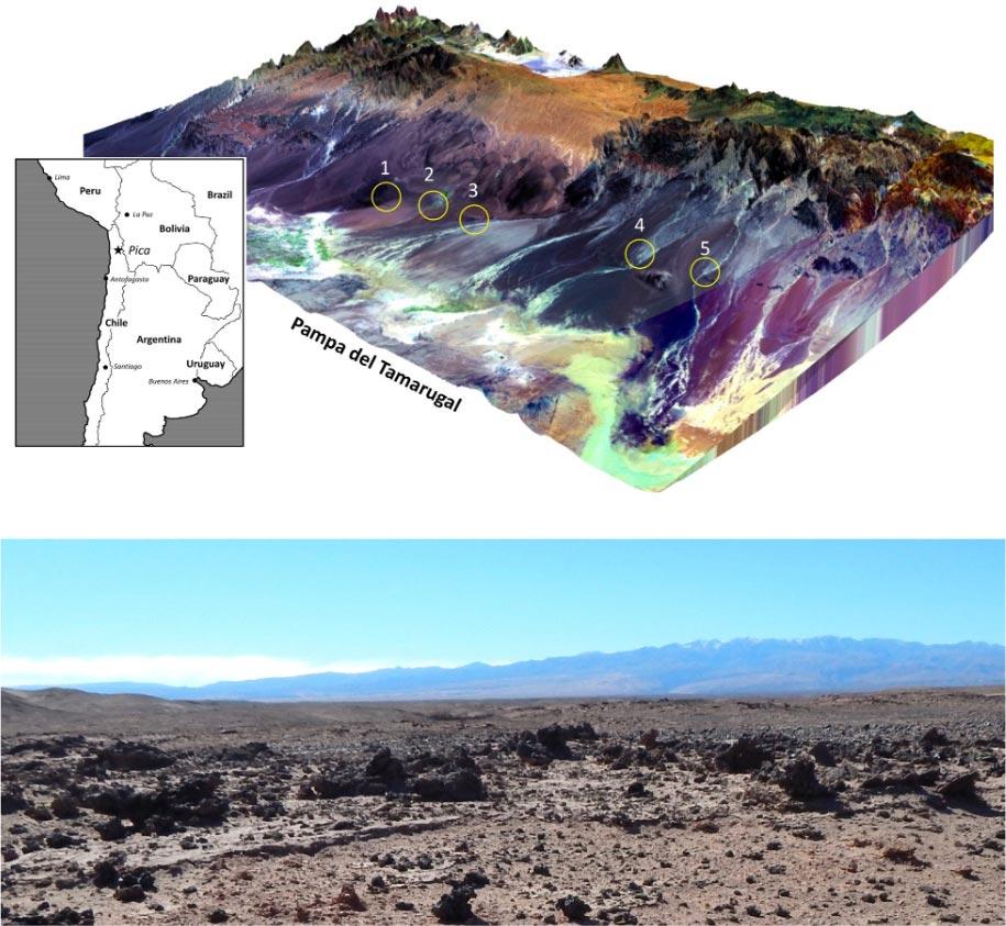 这些玻璃体集中在Pampa del Tamarugal以东的阿塔卡马沙漠上,这是智利北部的一个高原,东边是安第斯山脉,西边是智利海岸山脉。深绿色或黑色的玻璃田出现在一个延伸约75公里的走廊内。舒尔茨说,没有证据表明这些玻璃可能是由火山活动产生的,因此它们的起源一直是个谜。