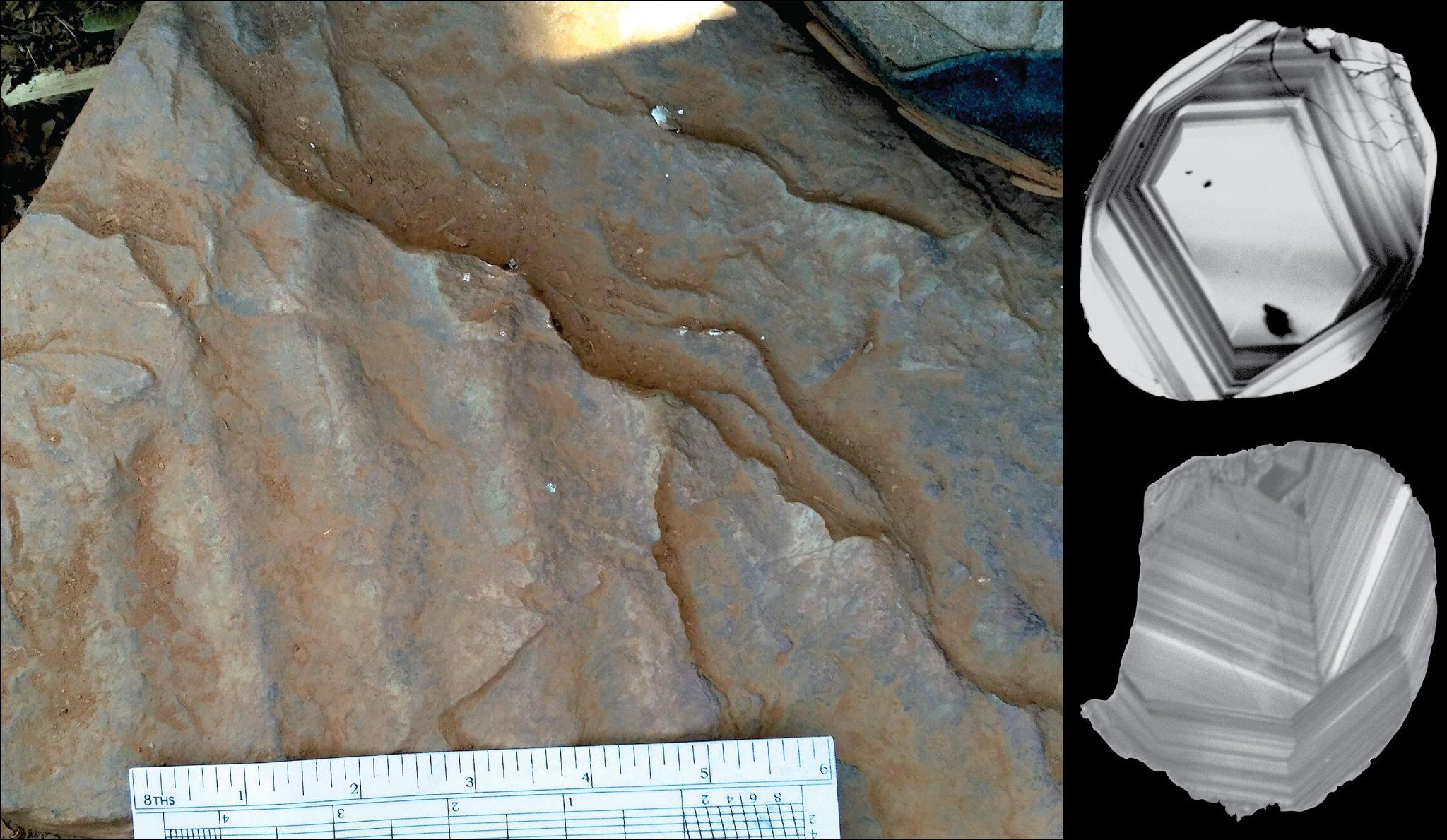 左图:砂岩地层(用尺子表示);右图:锆石颗粒(显微图像)