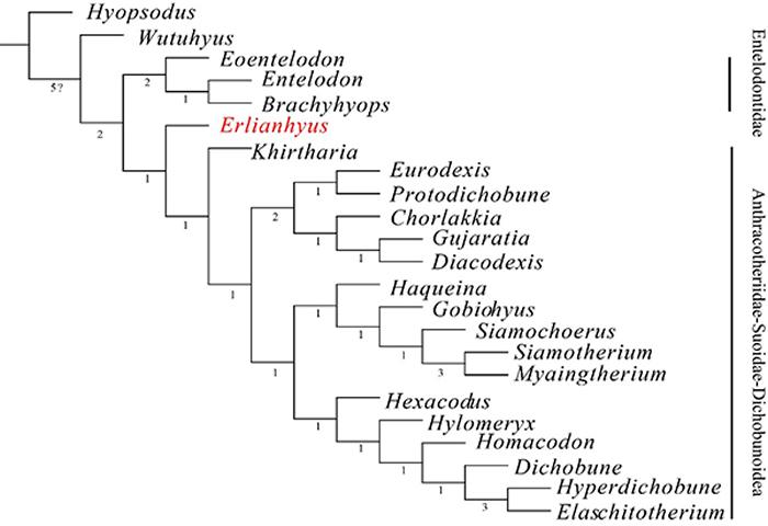 进一步的系统发育分析结果表明,“二连豨”在早期偶蹄类中位于较为基干的位置。根据“二连豨”完全丘型齿的特点推断这一类动物很可能以较嫩的植物为食,以避开与动物群中占主导地位的奇蹄类之间的食物竞争。