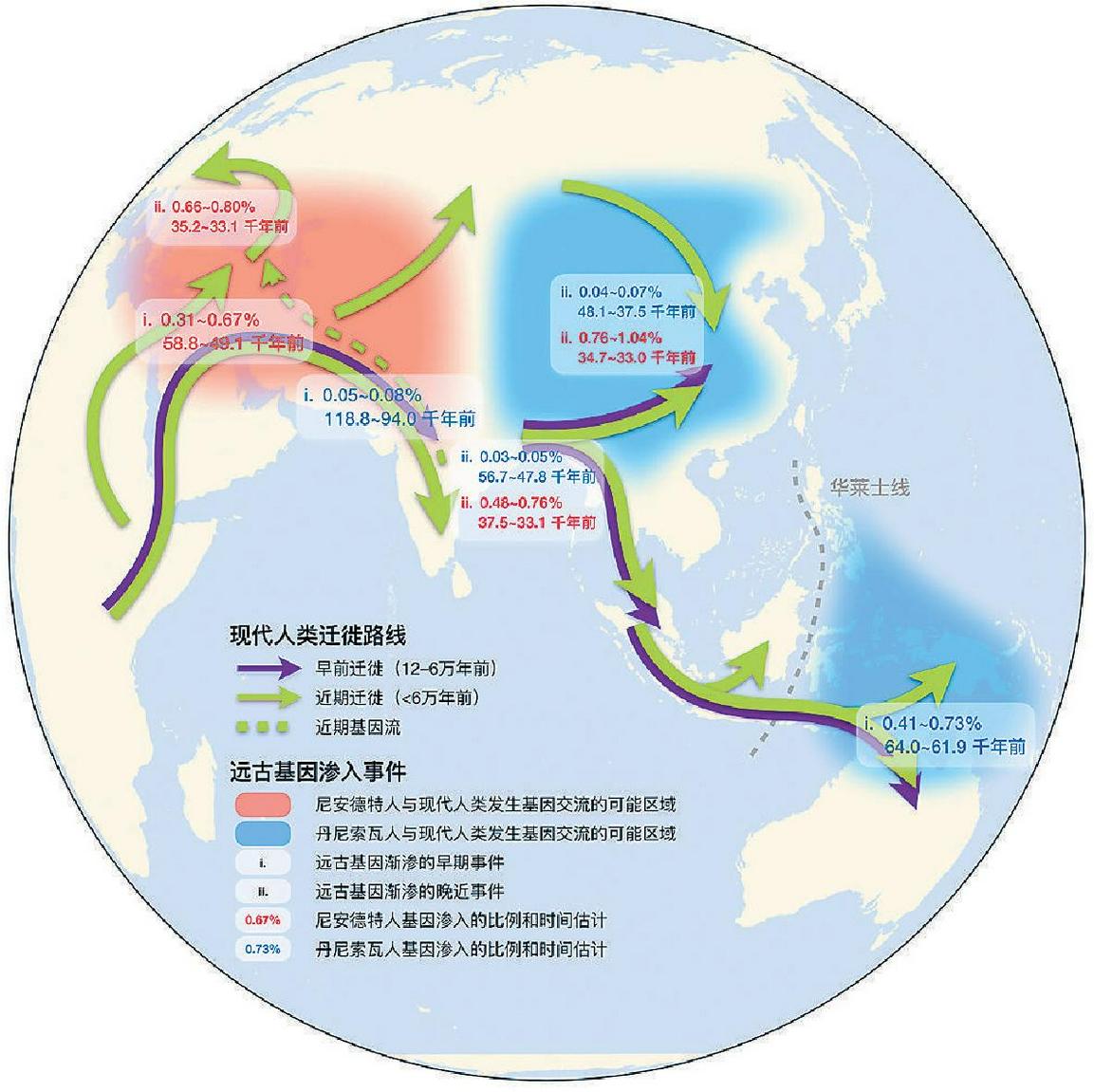 早期走出非洲的现代人类祖先,在距今约9.4万年到11.9万年前,在中东、南亚附近,与丹尼索瓦人发生了第一次接触和基因交流。而后,他们继续向东前进,一部分留在南亚,一部分向北到达东亚南部,并分别与本地的丹尼索瓦人发生遗传交融。还有一支继续向东南迁徙,在距今6.2万年至6.4万年前,穿过华莱士线到达大洋洲,与已先期到达的一支丹尼索瓦人融合。