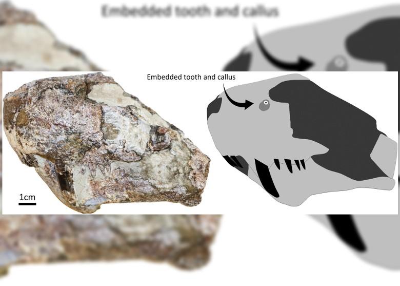 来自南非金山大学及伊齐科博物馆(Iziko Museum)的考古团队,今年初继续分析一个1940年在首都开普敦出土的丽齿兽头骨化石时,发现其鼻骨位置嵌有一颗牙齿。研究人员相信,该丽齿兽死前2至9周遭另一只同类噬咬,对方留下这颗牙齿,但攻击并不致命,有愈合迹象,表明不太可能由咬伤引起的感染致死。