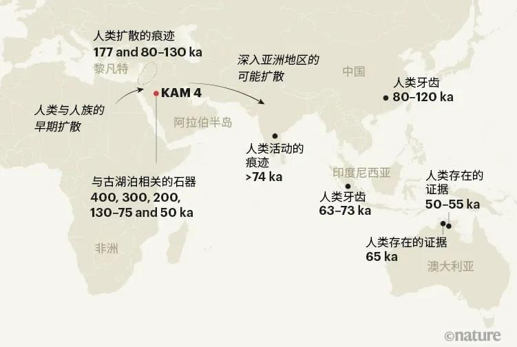 图一 | 古人类的迁徙。在过去的40万年里,智人和他们的人族近亲曾经多次从非洲扩散进入阿拉伯半岛。我们知道人类可能早在6.5万年前(65 ka)就已经抵达了澳大利亚[11](最晚也在5万到5.5万年前[10])。然而,他们是何时从阿拉伯地区经由亚洲南部扩散至印度和东南亚的、这类迁移活动发生的频次又是多少,这些都是目前人类亚洲定居史上最不确定的地方。根据Groucutt团队的研究报告[1],他们在Khall Amayshan考古遗址(称为KAM 4)挖掘出的石制品对应了五个人类居住期。结合来自黎凡特、亚洲及澳大利亚的其它定年数据(图中展示了其中数例)[5·6·10·11·13-15],关于这些早期扩散事件,一幅更为全面的图景正在浮出水面。