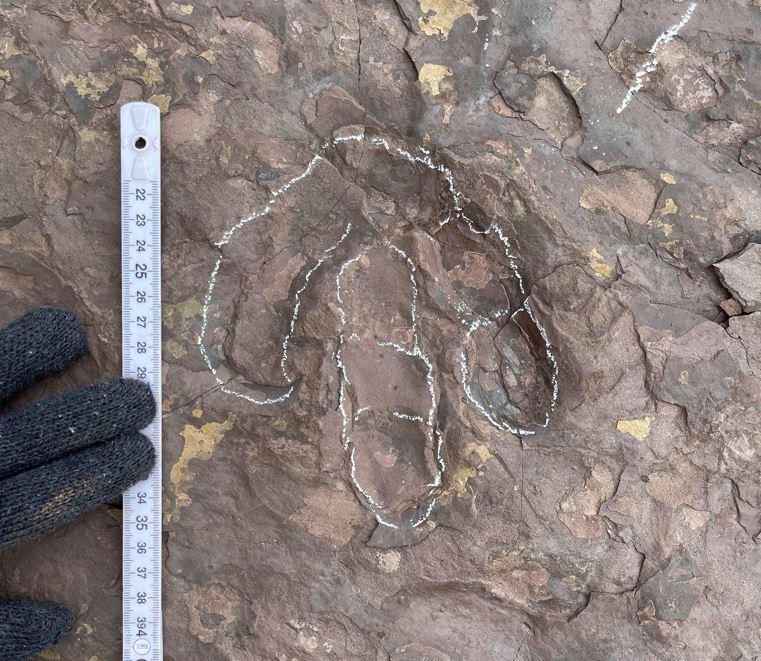 本次研究,共发现7个兽脚类恐龙脚印,包括两个孤立足迹和一道行迹。其中,一道兽脚类恐龙行迹的保存状态最好,且向东北方向延伸。其形态类似于副强壮足迹属(Paracorpulentapus)。比如:都是中等尺寸的、粗壮的兽脚类足迹,中趾前凸较弱,平均长宽比为1.4,第II-IV趾的平均趾间角为58°。因此,学者们暂时将其归入副强壮足迹。