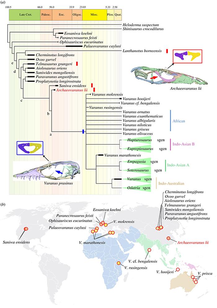 巨蜥类的系统发育学(A)和巨蜥类化石的地理分布(B):始祖巨蜥(Archaeovaranus lii)是巨蜥属(Varanus)的最近属种