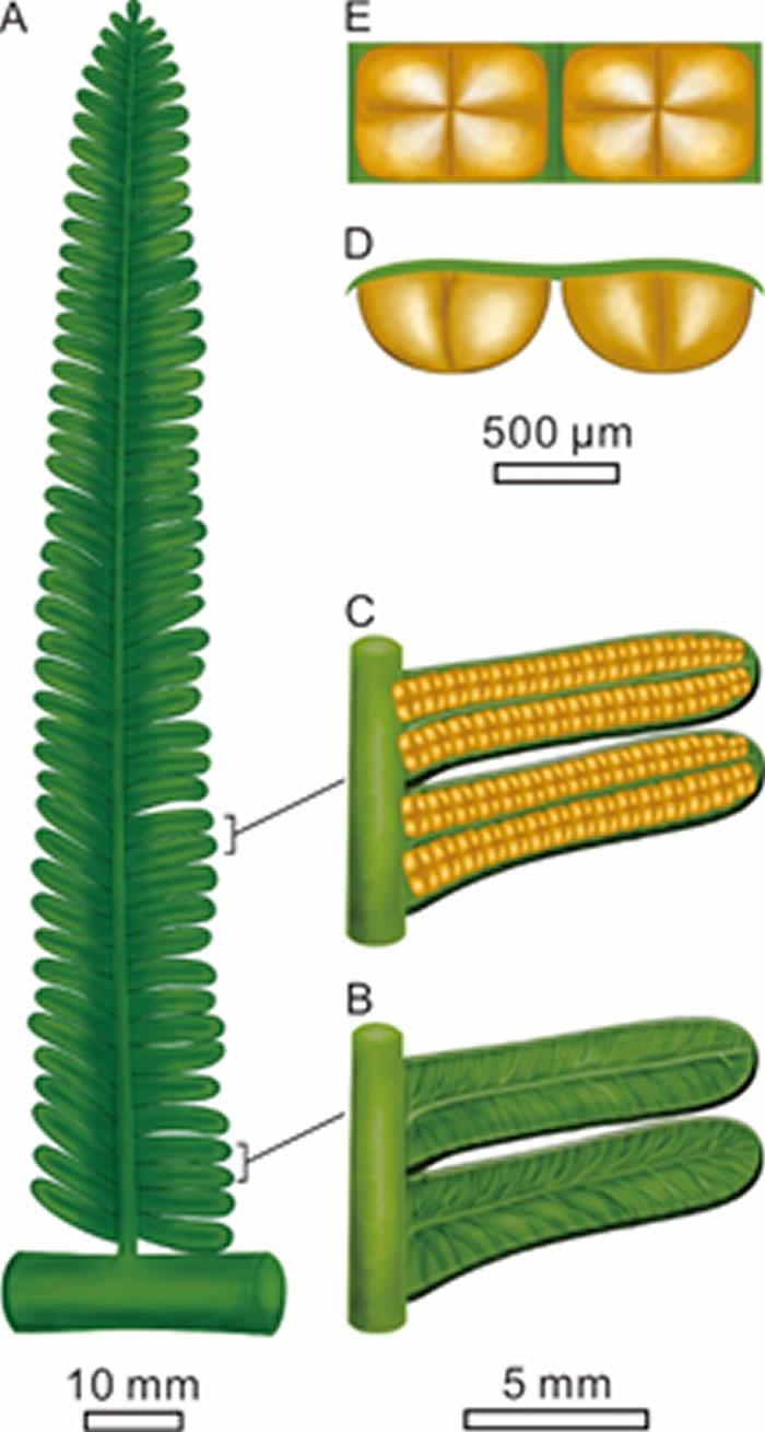 最近,云南大学植物古生态研究团队在云南省曲靖市富源县和贵州省六盘水市宣威组采集到保存精美的莲座蕨植物标本。保存形式为压型化石,同时保存有营养羽片和繁殖羽片。该植物的主要特征为:蕨叶至少具二次羽片,具有线形至披针形的末次羽片。小羽片为栉羊齿型,羽状叶脉。繁殖羽片叶缘微卷,羽片背面的聚合囊在中脉两侧排成两列。聚合囊排列紧密,密度为每厘米14–17个;压缩后俯视呈有规则的矩形或卵圆形,0.7 mm长,0.4 mm宽,两侧对称,由四个完全融合的孢子囊组成一个聚合囊。孢子囊无环带,平均370 μm长,200 μm宽,外壁由三层细胞厚的矩形或伸长的多边形细胞组成。原位孢子球形或椭球形,直径25–35 μm,通常30 μm,具三射线,表面具微疣形纹饰,与分散孢子Cyclogranisporites属特征一致。经详细对比研究,该化石植物属于Pectinangium(篦囊蕨属)一新种:Pectinangium xuanweiense Zhou, Guo et Feng(宣威篦囊蕨)。