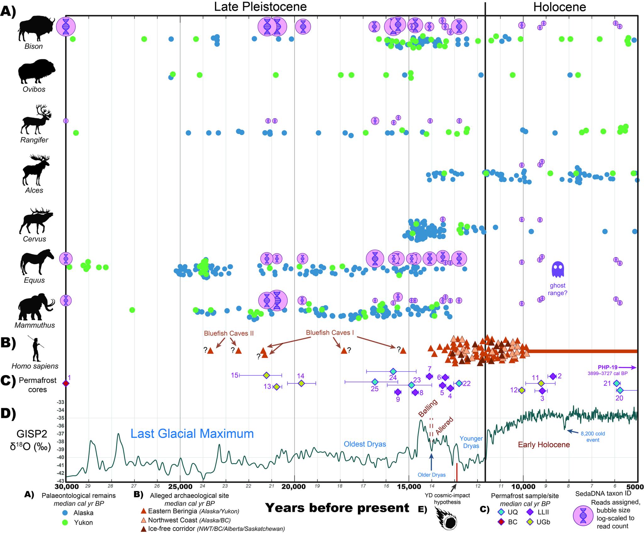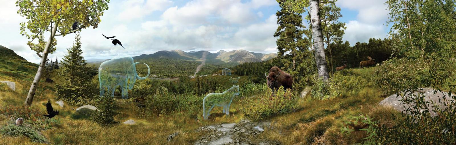 这带来了标志性冰河时代巨型食草动物的消失,如猛犸象、育空马和草原野牛以及美洲弯刀猫和贝林吉亚狮等掠食者。研究人员发现了来自各种古代动物的环境DNA,包括猛犸象、马、草原野牛、驯鹿、啮齿动物、鸟类和许多其他动物。
