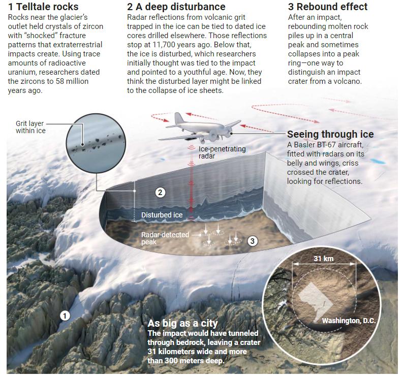 这颗小行星砸向地球并留下了一个三十一公里宽、一公里深的火山口。这个陨石坑足以容纳整个华盛顿特区。今天,这个陨石坑位于格陵兰岛西北部的海华沙冰川之下。从冰川流出的河流为研究人员提供了5800万年前被撞击过度加热的沙子和岩石。