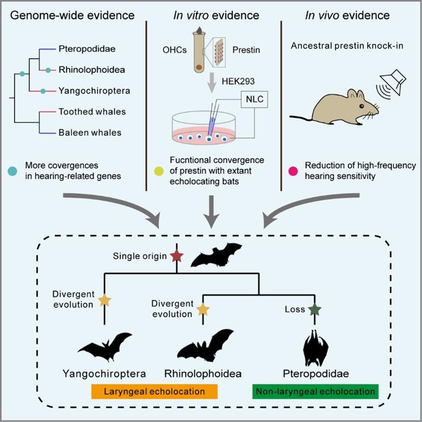 研究人员首先对蝙蝠祖先支(LCAB)、不具备回声定位能力的旧大陆果蝠祖先支(LCAP)等不同的祖先支系与具有回声定位能力的齿鲸(Toothed whales)进行了分子趋同进化分析。结果发现,与LCAP不同,听觉相关基因在LCAB与齿鲸之间具有显著的趋同演化信号。同时,通过重构LCAB和LCAP的回声定位相关基因prestin发现,与LCAP相比,LCAB的prestin功能与现生回声定位蝙蝠更相似。更重要的是,与LCAB-prestin基因敲入小鼠相比,LCAP-prestin基因敲入小鼠的高频听力明显下降。总之,该研究综合分子趋同分析、细胞功能实验、转基因小鼠听觉能力检测等多方面的证据,支持了回声定位起源于蝙蝠共同祖先,并且在现生回声定位蝙蝠类群中经历了趋异演化。