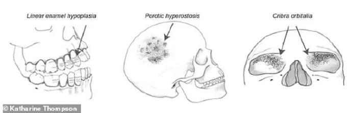 图为研究中评估的非特异性应力骨骼指标图。骨质疏松性骨质增生是一种影响颅盖骨的疾病,其特征是海绵状或多孔性骨组织区域。线形牙釉质发育不良是指牙釉质发育不全;眶筛是指颅骨的多孔性病变。