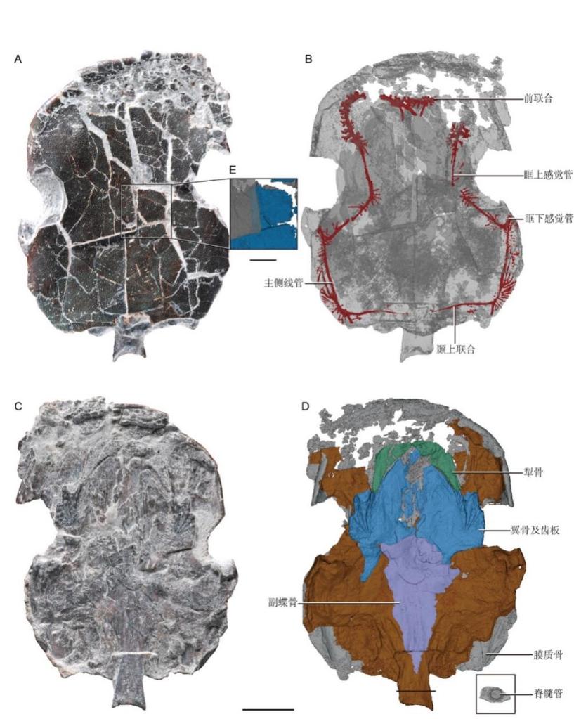 A,会泽滇双翼鱼正型标本(背视);B,会泽滇双翼鱼感觉管系统三维虚拟模型(背视);C,会泽滇双翼鱼正型标本(腹视);D,会泽滇双翼鱼膜质骨、犁骨、翼骨与副蝶骨三维模型虚拟(腹视)。(罗彦超供图)