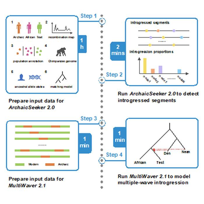 现代人类与古人类在漫长的演化历史中存在着错综复杂的基因交流关系。由于现代人群中目前所保留的基因渗入比例较低且渗入时间较为久远等因素,之前用于检测古人类对现代人类的基因渗入片段的方法大都未取得良好的效果,此外,精细化重构现代人类与古人类之间的基因交流历史模型也存在较大的难度。ArchaicSeeker 2.0能针对性地解决这些问题,有效检测和量化近缘种的基因交流并在更精细的尺度上重构复杂的基因交流历史。该方法主要由以下三个功能模块组成:(1)搜寻潜在的基因渗入片段;(2)将渗入片段匹配至对应的祖先人群;(3)构建遗传渐渗历史模型。此前关于ArchaicSeeker 2.0方法的介绍参见http://www.sinh.cas.cn/xwgg/kyjz/202111/t20211102_6240465.html。