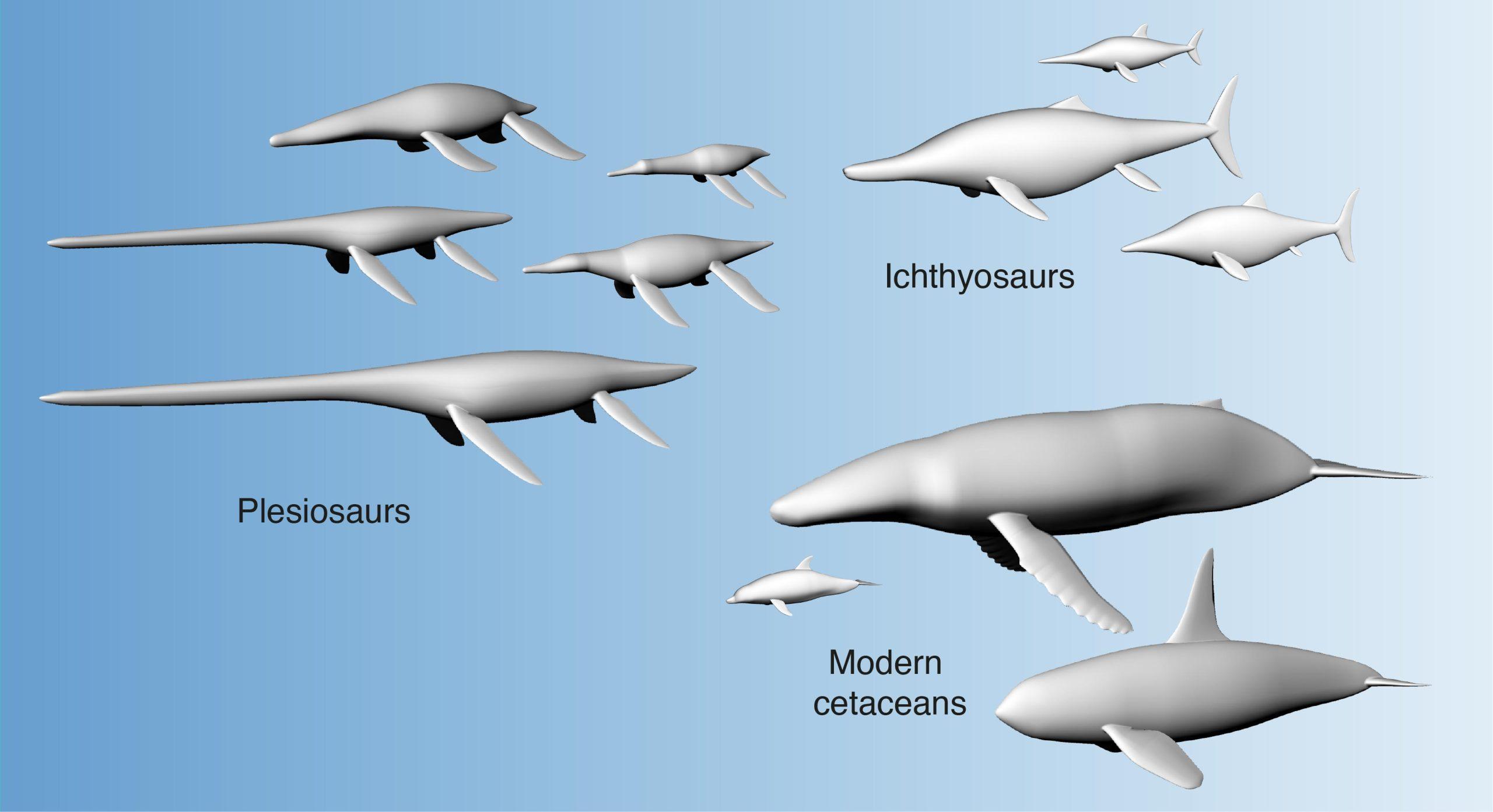 海豚和鱼龙有类似的身体形状,适应于在水中快速移动,身体构造让水的阻力非常低。另一方面,在中生代与鱼龙并存的多足龙,其身体完全不同。它们用来在水下飞行的巨大的四只脚蹼,以及不同的颈部长度,在现有活着的动物中是不存在的。有些古爬行生物的颈部长达20英尺(6米)。这些脖子可能有助于它们捕捉快速移动的鱼,但也被认为会使它们变得更慢。