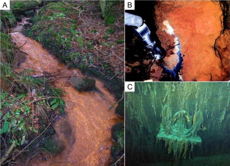不同水环境中的铁氧化菌菌席 A:富Fe溪流中的铁氧化菌菌席;B:海底火山喷口的铁氧化菌菌席;C:受铁氧化菌腐蚀的泰坦尼克号残骸