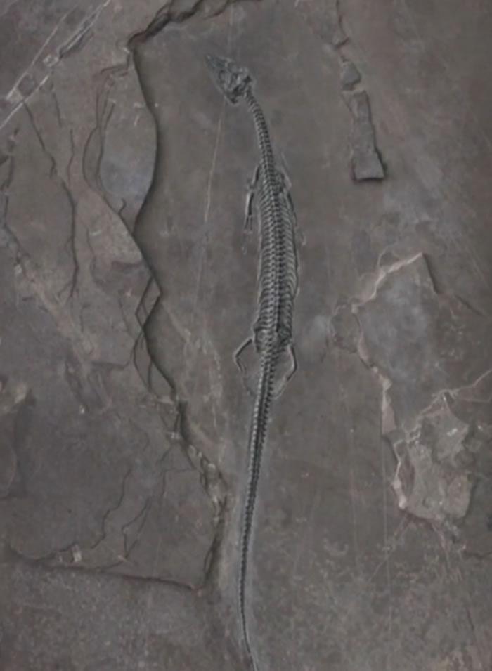 (化石网整理)据中新网(记者 孙自法 制作 吴瑞):5月9日,中国科学院古脊椎动物与古人类研究所(中科院古脊椎所)发布消息说,该所徐光辉研究员领导的科研团队在云南红河发现一件2.44亿年前完整的海生爬行动物化石,通过深入分析研究,确认它是迄今所知世界上尾巴最长、中国最早的肿肋龙科新属种,并将这个海生爬行动物命名为“长尾红河龙”。