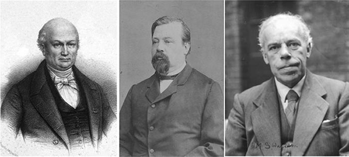 图2 最早提出喷水孔起源理论的三位科学家。法国动物学家圣西兰(Saint-Hilaire) (左),德国著名解剖学家卡尔·根格包尔(Carl Gegenbaur)(中)和英国古生物学家戴维·沃特森(David Watson)(右)(图片来自网络)