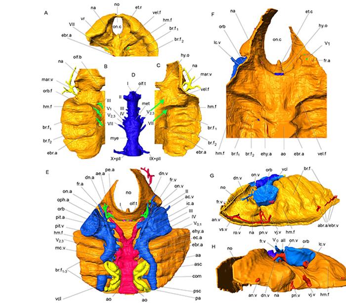 从2002年起,研究团队就在浙江长兴志留纪地层中开展野外工作,并在这里找到了一种最为原始的真盔甲鱼化石,后来把它命名为曙鱼(Shuyu)。这些曙鱼化石都是具有三维立体软骨脑颅保存的珍贵标本,而且个头而都非常的小,只有我们的指甲盖那么大,非常适合应用大科学装置同步辐射X射线显微成像技术进行三维无损扫描。2006年,研究团队把曙鱼的脑颅标本带到了位于瑞士苏黎世的瑞士光源进行了无损扫描。 之后又应用三维重建软件对曙鱼的脑颅进行三维虚拟复原,前后历时5年总共完成了七件曙鱼脑颅化石的三维重建,在只有指甲大小的脑颅里,几乎重现了曙鱼所有脑区、感觉器官及头部神经与血管的通道(图3)。