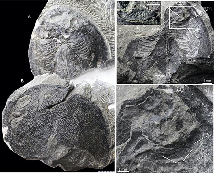 图4 在云南曲靖早泥盆世宽甲鱼化石中首次发现鳃丝印痕,揭示我们的中耳曾经是鱼类用来呼吸的鳃(盖志琨摄)