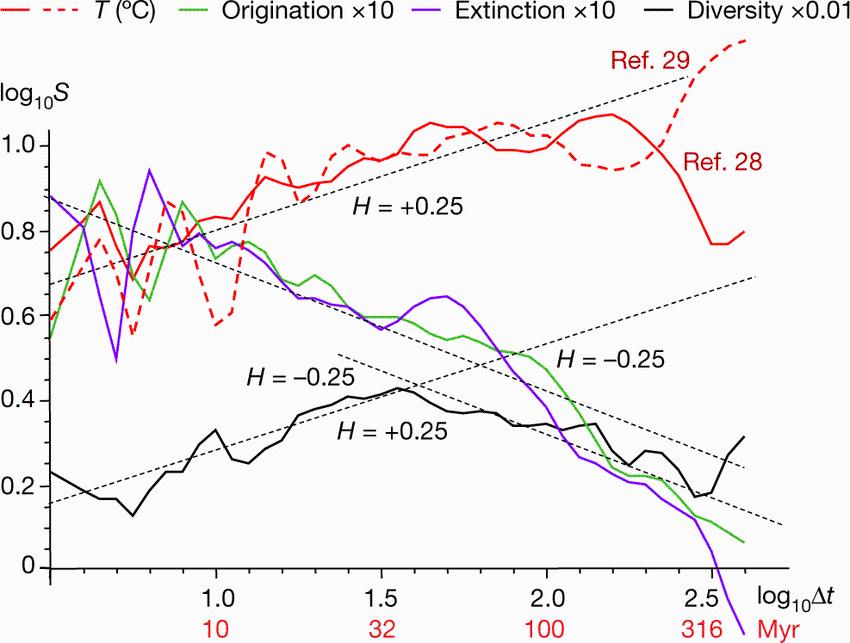 在整个观察范围内,从几百万年到几亿年,研究人员发现T、E和O的波动呈现出时间尺度的行为。巨型气候的特点是正的缩放指数-因此它显然是不稳定的。E和O也有扩展性,但指数为负-稳定的行为,是由生物介导的。对于D,有两个制度,在关键时间尺度Δttrans≈40Myr时有一个交叉。对于较短的时间尺度,D表现出与大气候古温度几乎相同的正比例,而对于较长的时间尺度,它跟踪宏观进化率的比例。在至少Δttrans的尺度上,E和O的多样性依赖性开始出现,这可能是由于地理分散造成的生物群的混合和同步化(全球化)。