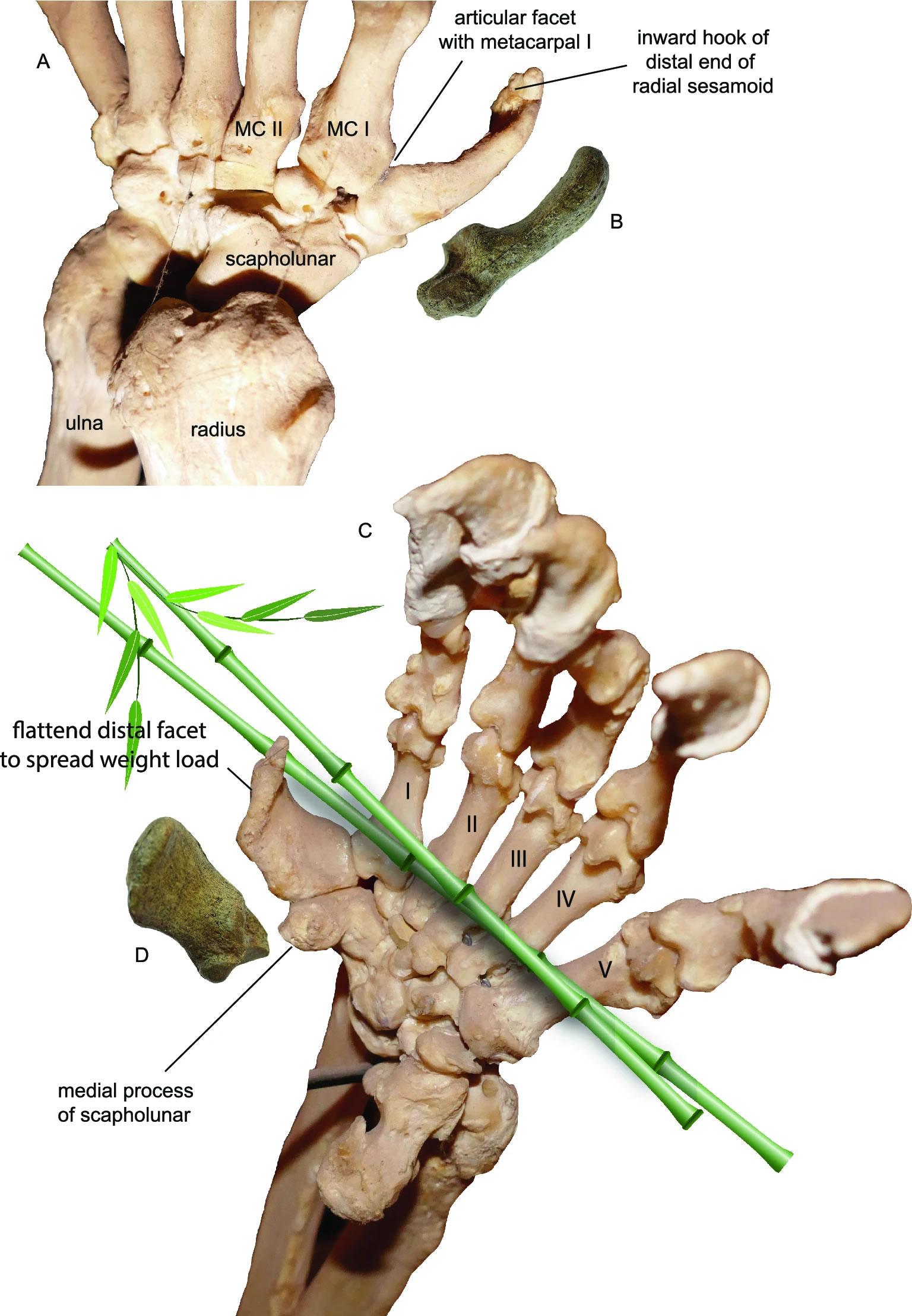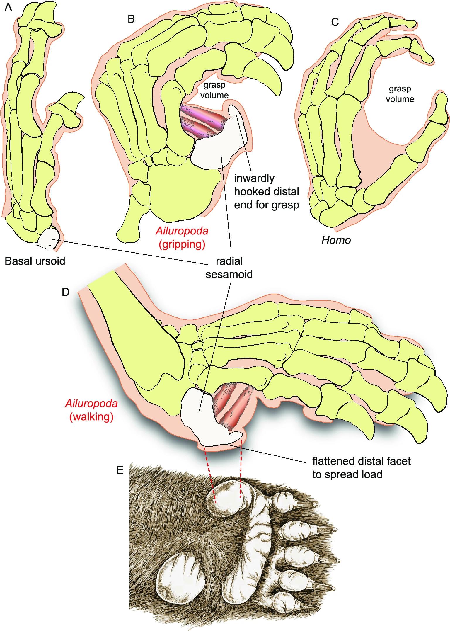 人类及其灵长类近亲最重要的特征之一,就是演化出能与其他手指对握的拇指来进行精确的抓握,这不仅需要关节的灵活性,还需要屈肌和伸肌的复杂相互作用。大熊猫的抓握与人类的抓握有根本不同,其桡侧籽骨通过固定关节与第一掌骨和舟月骨形成了一个功能复合体,与其他掌骨联动,而不能够像人类拇指那样独立于其他手指运动。