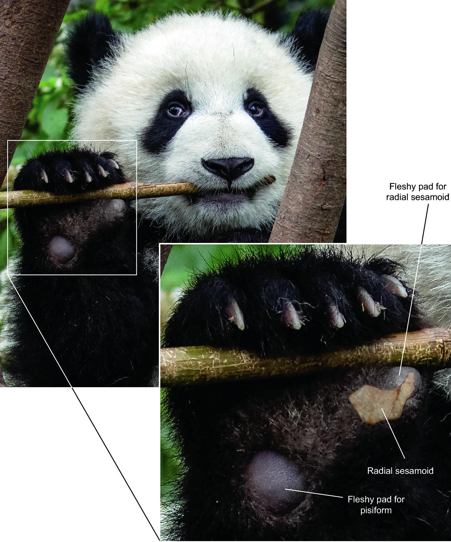 大熊猫为了能吃竹子,演化出了很多“独门绝技”,伪拇指就是其中之一——除了大多数哺乳动物前肢上正常的五个手指外,大熊猫还有一个强烈增大的手腕部骨骼,即桡侧籽骨,充当第六个手指,形成可以对握的“拇指”来抓住竹子。研究表明,熊猫简陋的伪拇指很难用于采集熊科通常的杂食原料,如种子、坚果、浆果,甚至矮草等,这表明增大的桡侧籽骨的唯一取食目标就是竹子,伪拇指是熊猫谱系中有效采集竹子的关键适应。