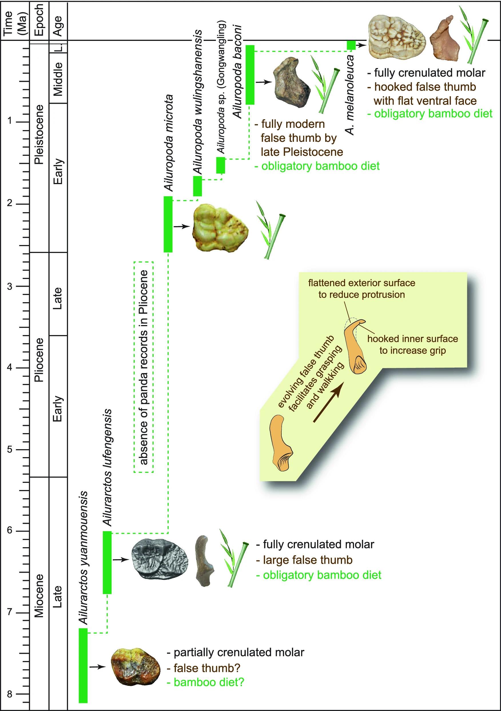 熊猫从广泛的杂食性过渡到一心一意吃竹子,按理说需要在解剖学、生理学以及遗传学基础上进行多重改变。然而,即使经过至少600万年专注于吃竹子的历史,这些转变仍然有限,主要集中在取食技能上,而大熊猫的消化系统仍然是食肉动物的配置。中新世晚期以后,熊猫家族的伪拇指没有进一步伸长的事实表明,它们已获得足够的抓握力来对付竹子。也就是说,足够抓紧一根竹竿或一把竹子,同时还要撑着肥胖的身体行走,伪拇指不长不短正合适。