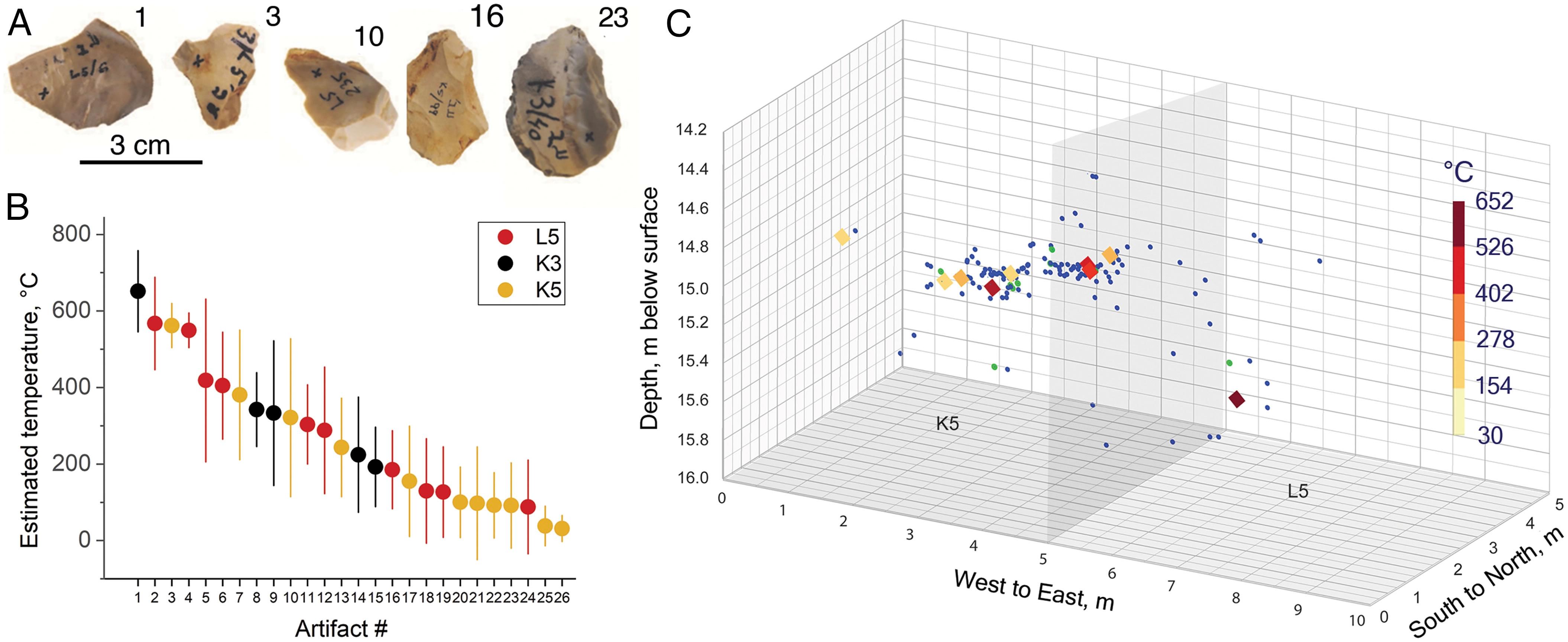 研究人员指出,通过将材料的化学成分精确定位到分子水平,人工智能可以评估石器被加热到的温度,最终提供有关过去人类行为的信息。他们评估了该遗址发现的26件燧石工具的热暴露情况,结果显示,有些工具被加热到超过600摄氏度。此外,他们使用不同光谱技术分析了87具动物遗骸,发现一头已灭绝大象的象牙因加热导致身体结构发生了变化。