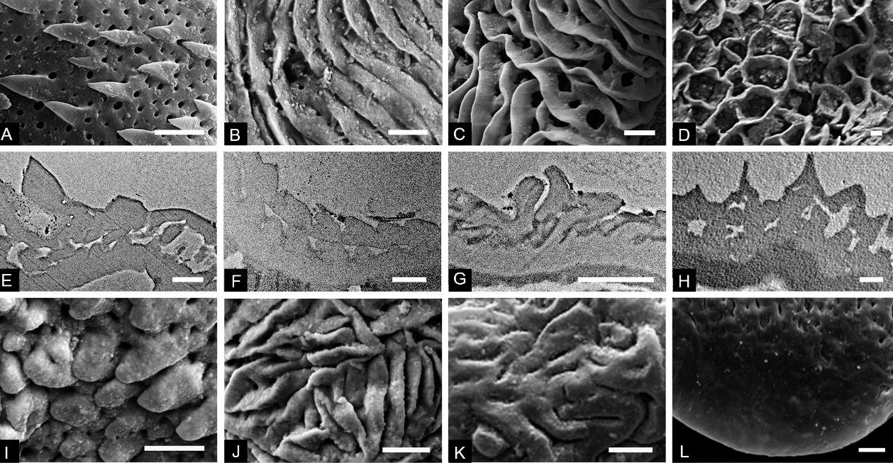 三突起类代表性纹饰的SEM、TEM照片
