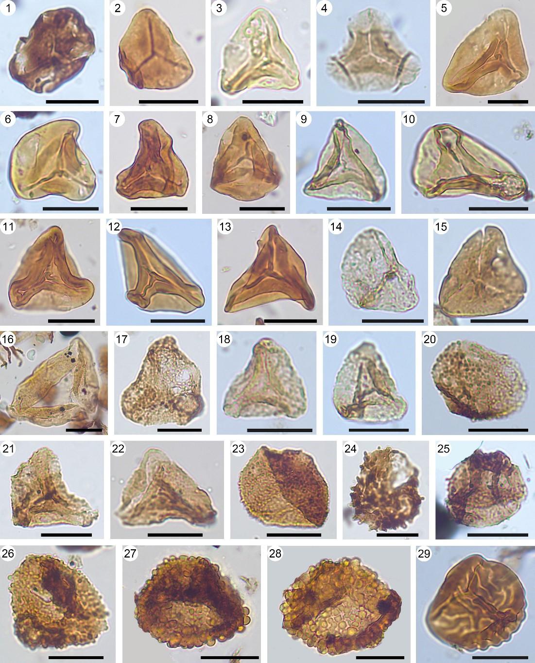 四川江油马鞍塘剖面马鞍塘组代表性孢子化石(比例尺均为20 μm)