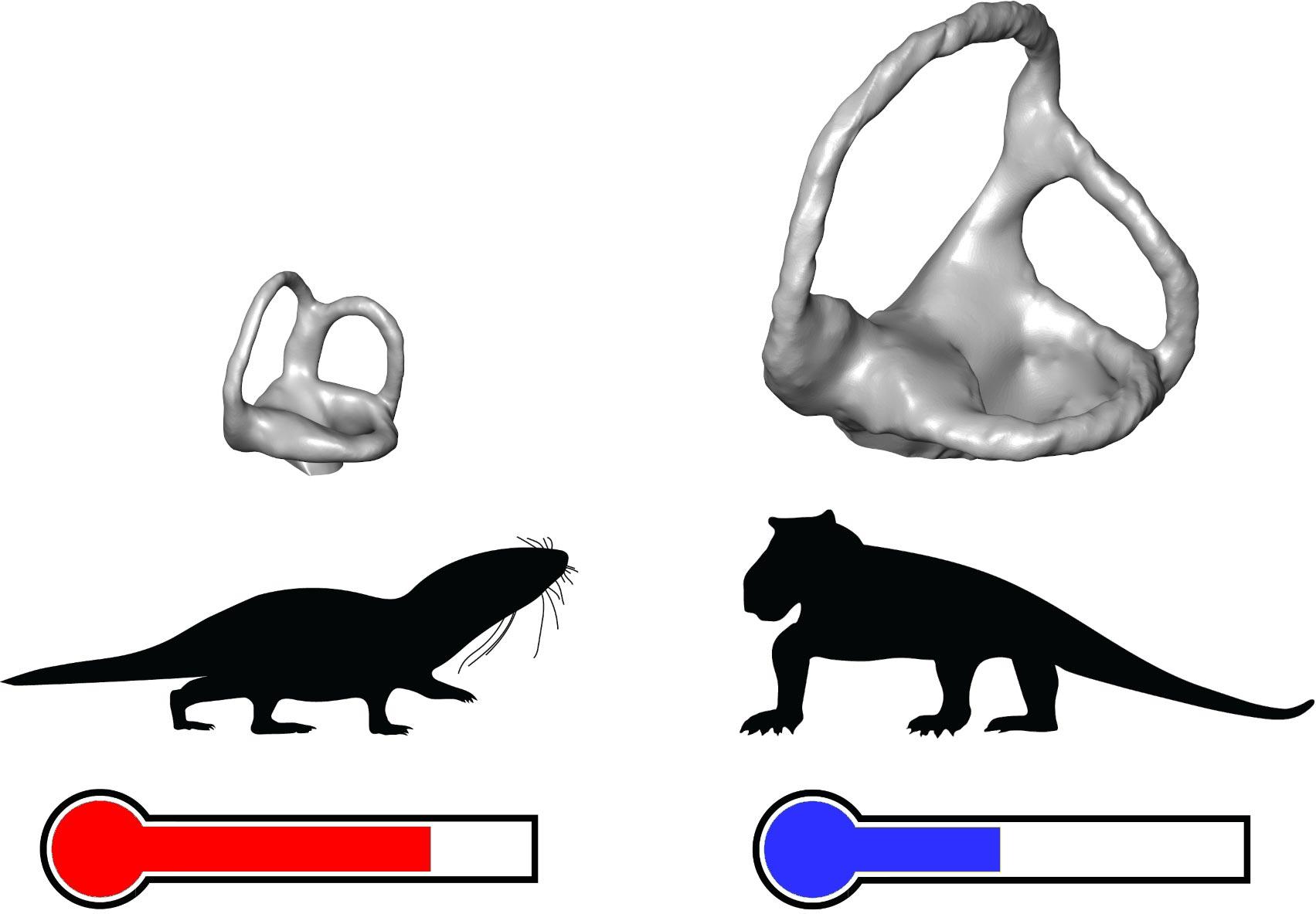 研究人员分析了56种灭绝的下孔类动物(类爬行动物,哺乳动物的祖先)的内耳道,通过索引发现,在三叠纪晚期,从2.37亿年前到2.01亿年前,内耳道形状发生了突然的变化。研究人员认为,这是下孔类动物变成恒温动物的时间。这一转变意味着它们的体温升高5℃~9°C,新陈代谢加快。