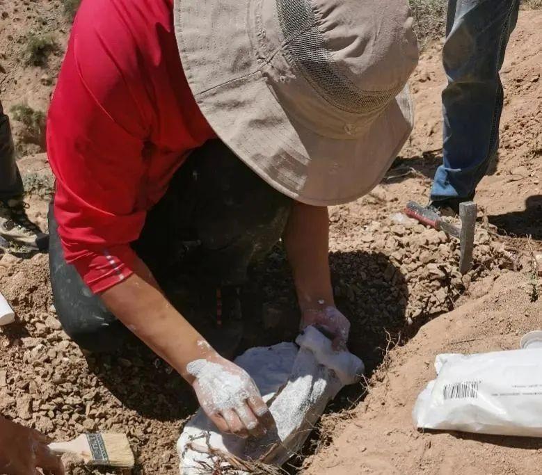 研究人员在化石点制作石膏包