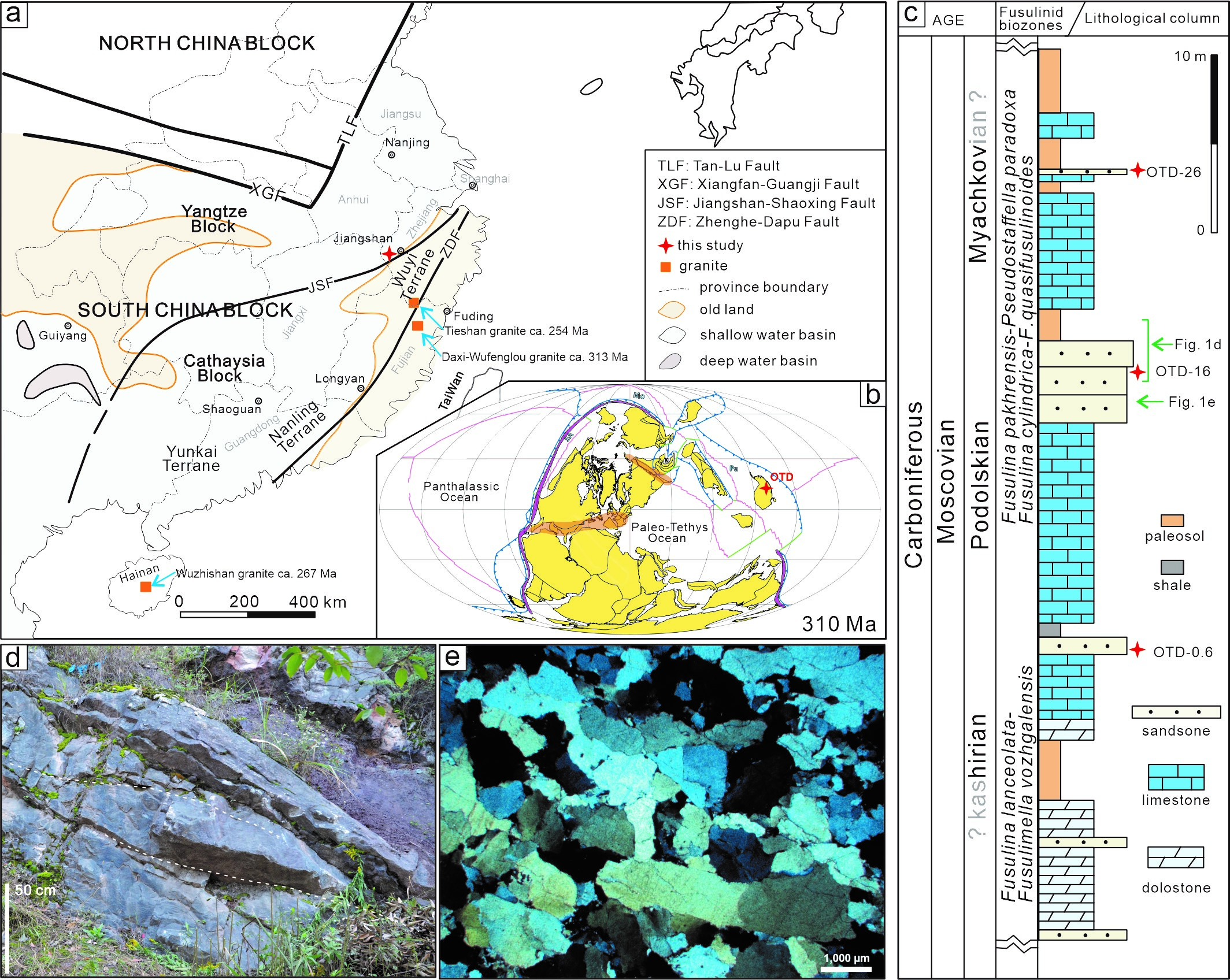 近期,中国科学院南京地质古生物研究所晚古生代团队高彪博士后及其合作导师陈吉涛研究员,联合团队郑全锋副研究员、黄兴博士和博士生辛浩等,针对浙江省江山市晚石炭世的一套碳酸盐岩与碎屑岩混合沉积序列开展了沉积学、生物地层学、碎屑锆石U-Pb测年、锆石微量元素测试及Hf同位素测试等综合性研究。研究对华南板块东南缘晚古生代构造环境进行了系统恢复,建立了华南板块东南缘中–晚古生代时期的构造环境和地质动力学模式。成果近期发表于国际知名期刊《地球物理研究通讯》(Geophysical Research Letters)。
