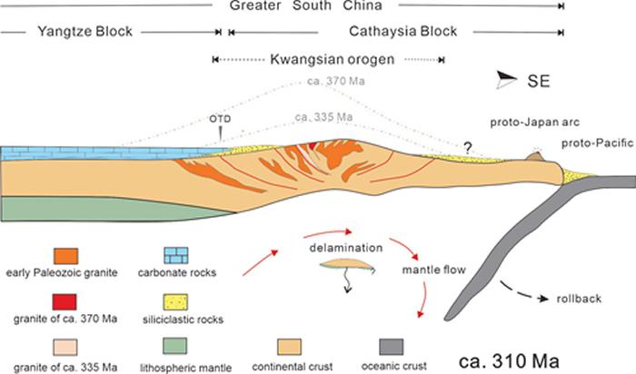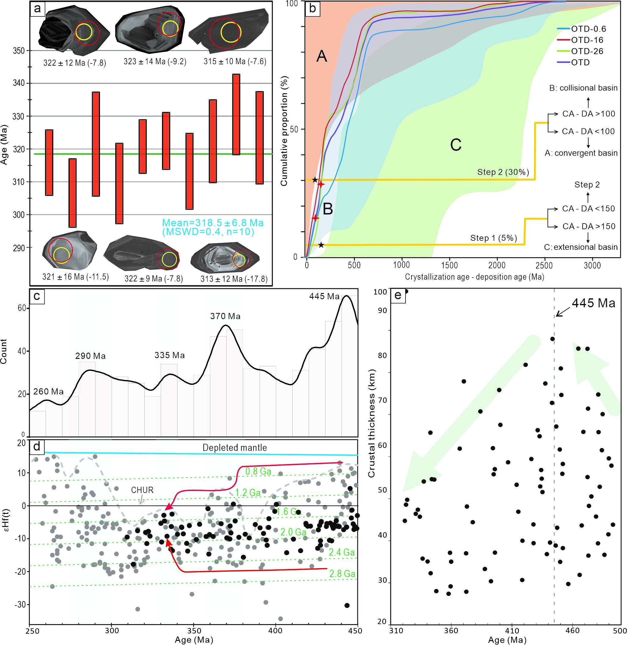 此次研究主要基于碎屑锆石的物源分析,结果表明碎屑沉积物主要来源于研究区东南侧的华夏古陆。结合碎屑锆石最年轻年龄数据与生物地层限定,揭示了物源区的岩体是在约318.5 Ma发生快速抬升遭到剥蚀。通过碎屑锆石Hf同位素数据,并结合基于微量元素计算的地壳厚度数据,共同揭示出华南板块在中–晚古生代时期其下部地壳物质不断拆离,进而导致地壳厚度减薄的过程(图2)。