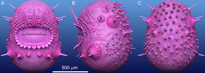 皱囊虫是毫米大小的两侧对称动物,具有囊形的身体和末端的开口,围绕口发育了辐射状皱褶,辐射对称排列的具刺突起。本次基于更多的、保存更加完整的化石标本的深入研究表明,皱囊虫身体两侧对称排列了具刺骨板,反口面有大量小刺,而曾被解释为“鳃孔”的结构,很可能是封闭的具刺骨板在化石化过程中磨损形成的孔状结构。皱囊虫的一些关键特征,比如发育表皮又叫角质层、上皮不具纤毛、末端的口和环口的辐射对称排列的结构,表明它和蜕皮动物有更近的亲缘关系,因此皱囊虫更可能是蜕皮动物而不是后口动物。