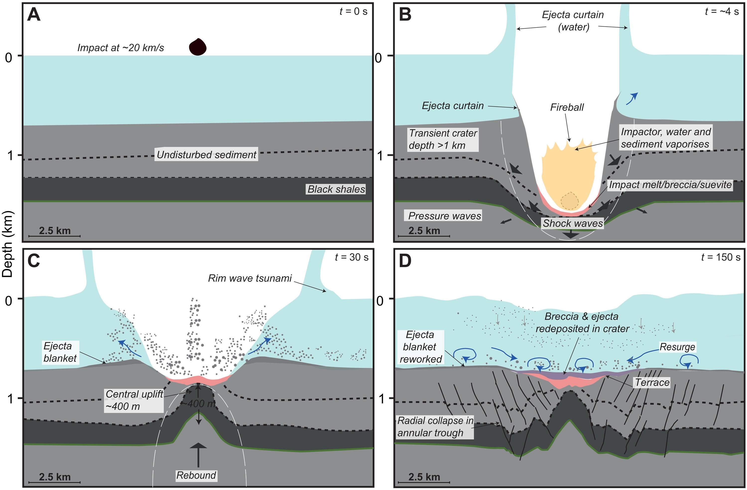研究人员使用计算机模拟来调查什么样的撞击物在什么样的条件下会产生所看到的陨石坑,以及可能产生的落尘有多严重。他们确定负责的小行星可能直径大约有400米(1300英尺),而且它似乎撞击了490至790米(1600至2600英尺)深的水体。