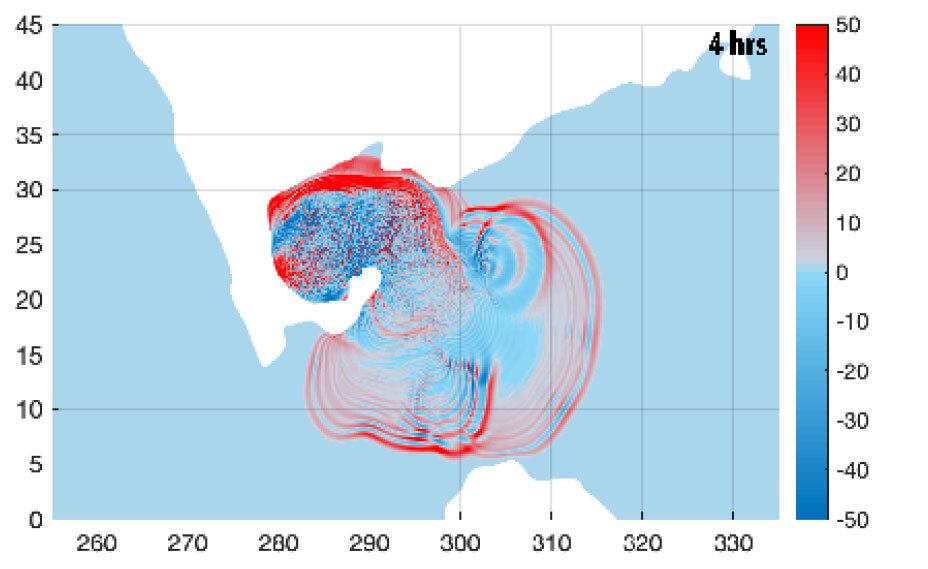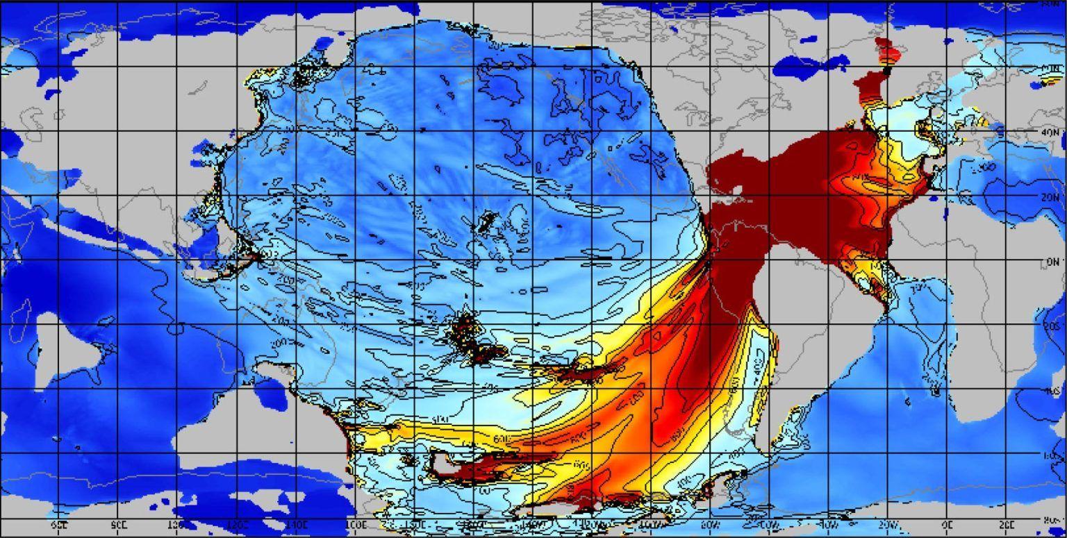 研究人员在白垩纪最上层海洋沉积物中观察到的侵蚀和间断的分布与模型结果一致。根据该研究的计算结果,撞击海啸的初始能量比2004年12月印度洋地震海啸的能量大3万倍。那次是现代记录中最大的海啸之一,并导致23万多人死亡。研究人员的模拟结果显示,撞击海啸主要向东和东北方向辐射到北大西洋,并向西南方向通过中美洲海道(过去将北美和南美分开)辐射到南太平洋。