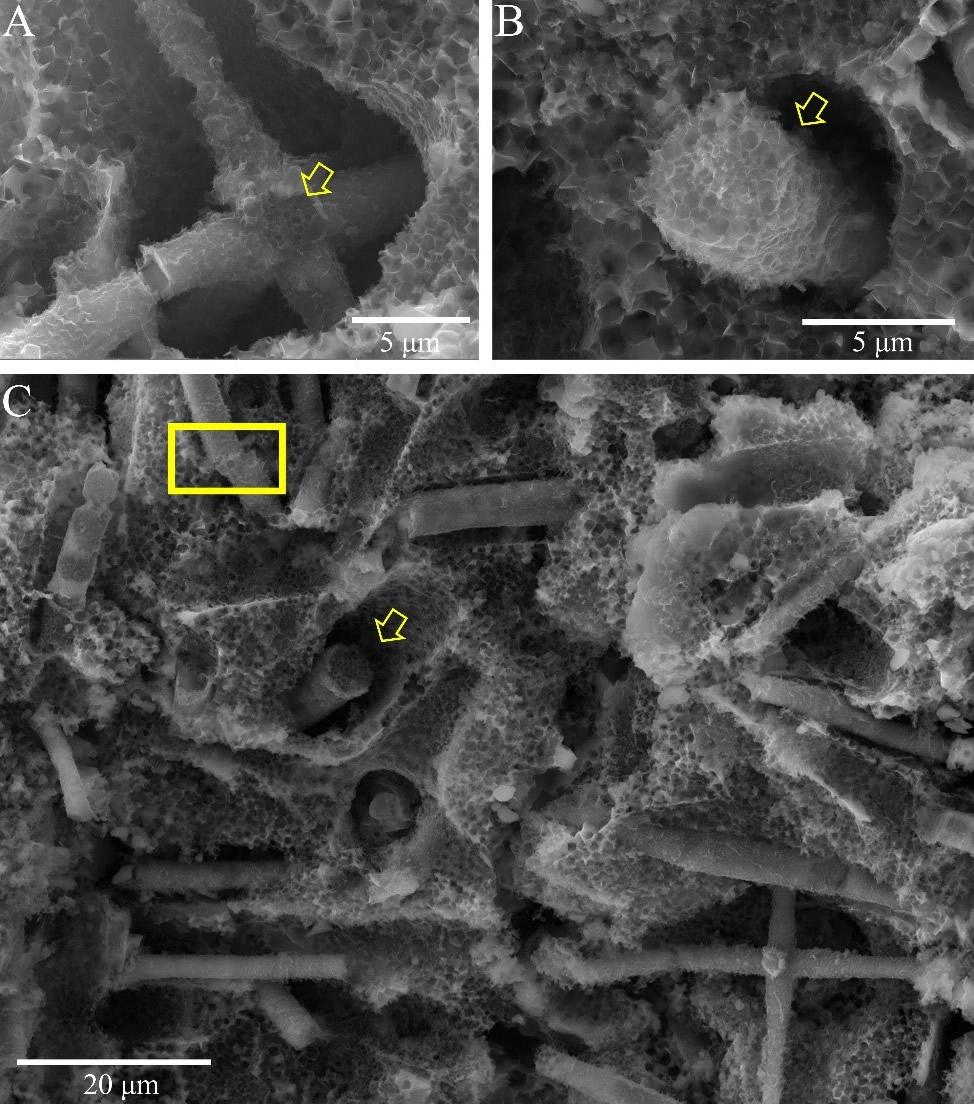 海绵动物软体组织以及骨针表面的“蜂窝状结构”(草莓状黄铁矿印痕)