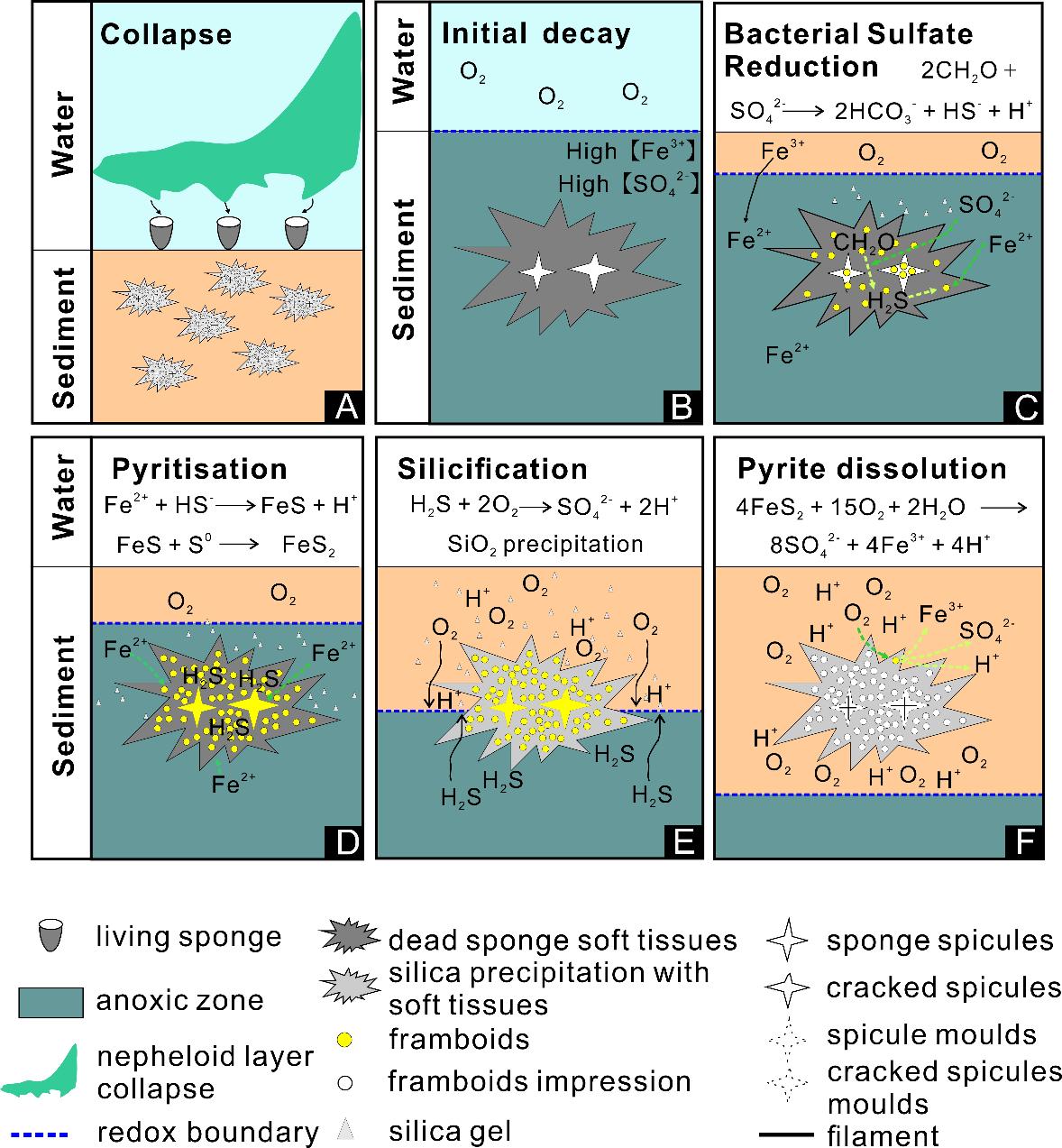 研究结果显示,海绵动物软体组织化石的保存经历了一系列复杂的化学过程,包括6个阶段:死亡埋藏—降解启始—硫酸盐细菌还原—黄铁矿化—硅化—去黄铁矿化。