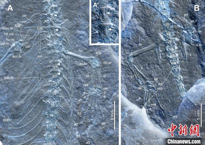 美丽莫旗蜥副型标本的肩带和前肢(A)、腰带和后肢(B)。中科院古脊椎所 供图