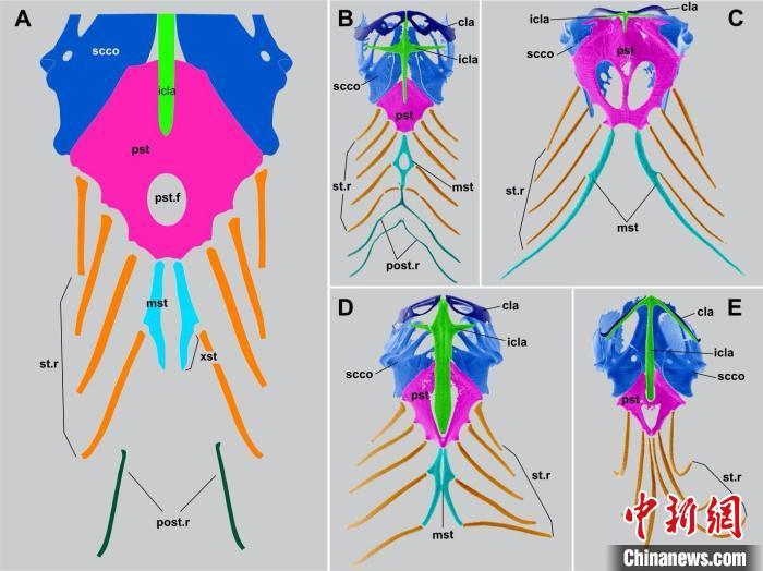 有鳞类胸骨结构的多样性:A.胸骨结构示意图;B.板蜥科;C.美洲鬣蜥类;D.臼齿蜥科;E.巨蜥科。中科院古脊椎所 供图