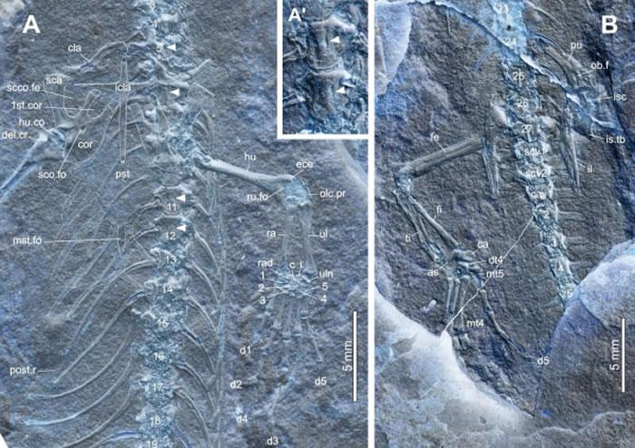 Moqisaurus pulchrum gen. et sp. nov.)副型标本(IVPP V25137)的肩带和前肢(A)、腰带和后肢(B)