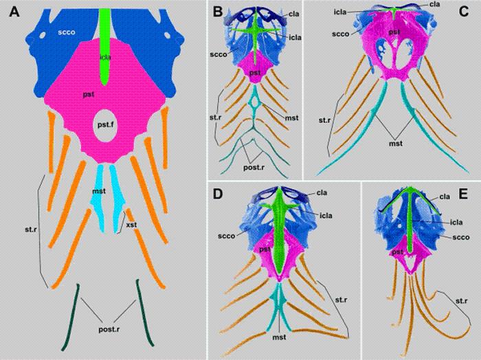有鳞类胸骨结构的多样性:A. 胸骨结构示意图;B. 板蜥科;C. 美洲鬣蜥类;D. 臼齿蜥科;E. 巨蜥科。
