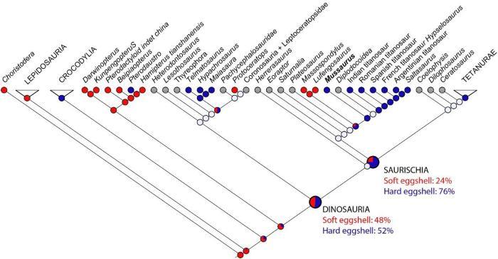 美国自然历史博物馆的诺瑞尔(Norell)等人曾于2020年在国际著名学术期刊《自然》(Nature)发表研究论文,他们用拉曼光谱和组织切片等手段,证明发现于阿根廷的鼠龙蛋(晚三叠世/早侏罗世)和发现于蒙古国的原角龙蛋(晚白垩世)为软壳蛋,并用祖先状态重建得出最早的恐龙蛋为软壳蛋的结论。