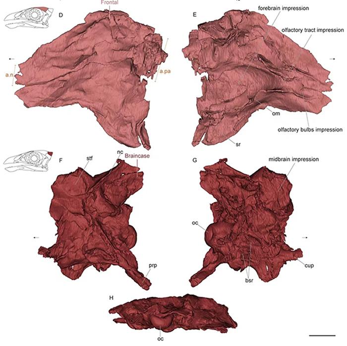 此项研究中涉及的重点标本热河鸟STM3-8上的脑颅部分保存较为立体,因此能够揭示部分脑部信息,填补从始祖鸟到今鸟型类之间的空白。结果显示,相较于现生鸟类,热河鸟的脑部形态整体更接近于始祖鸟。同时,嗅球的相对大小对于脊椎动物的嗅觉具有重要的指示性意义。新研究中将热河鸟的嗅球相对大小加入其他鸟类和非鸟恐龙的数据中进行比较,证明热河鸟可能具有相较于其他早期鸟类(如始祖鸟和孔子鸟)更好的嗅觉能力,而较好的嗅觉可能在其取食、方向识别、个体识别等方面发挥作用。