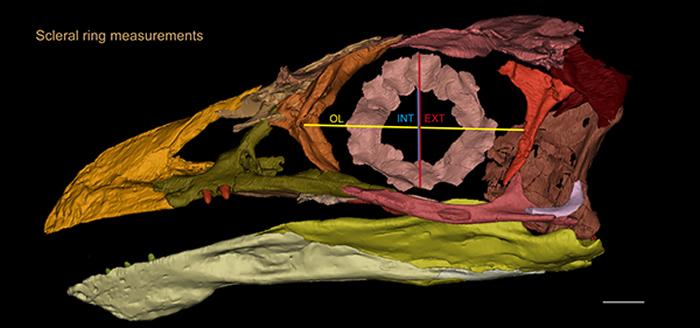 与此同时,研究人员还基于重点标本复原出了热河鸟的巩膜环结构,从而依据巩膜环的内外直径比例对热河鸟的视觉(日夜习性)进行了分析。结果显示热河鸟具有日行的生态习性,支持了在鸟类演化初期日行行为模式占主导的假说。现生鸟类也以日行性偏多,而日夜习性在非鸟兽脚类恐龙中则分布更加均匀,意味着在鸟类刚刚起源或起源后不久,可能即发生了趋向于现生鸟类的日夜习性转变。
