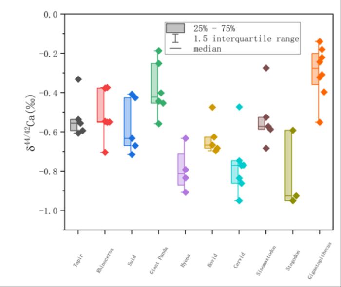 巨猿牙釉质钙稳定同位素的研究论文Calcium isotope ecology of Gigantopithecus blacki (~2Ma) in South China,第一作者为复旦大学的胡耀武教授,他与中国科学院古脊椎动物与古人类研究所赵凌霞研究员、成都理工大学张兆峰教授为共同通讯作者。巨猿动物群牙釉质钙稳定同位素比值(δ44/42Ca)分析(图2)显示:由于营养级效应(即δ44/42Ca随营养级上升而减小),食肉类动物(如鬣狗)具有最低的δ44/42Ca值,而食草类动物(如貘、犀、牛、乳齿象)以及杂食类动物(如猪),皆具有较高的δ44/42Ca值。与此同时,部分动物的δ44/42Ca值表现异常,如属食草类动物的鹿和剑齿象,其δ44/42Ca值却显著低于其他食草类动物和杂食动物,而与食肉类动物相似。尤其需要指出的是,大熊猫和巨猿的δ44/42Ca值最高。这表明这两种动物在早更新世柳城巨猿动物群中占据迥异的营养级位置。已有的研究表明,动物牙釉质中δ44/42Ca值,除受控于其营养级(食物因素)之外,还取决于动物牙齿生长发育过程中环境和生理因素对Ca新陈代谢的影响。由此可以看出,具有异常δ44/42Ca值的四种动物,很可能具有异乎寻常的Ca代谢。巨猿动物群的钙同位素δ44/42Ca值,与碳氧同位素δ13C、δ18O值的耦合,很好地区分了巨猿与其他伴生动物在生态环境和摄食行为的差异性(图1-3)。
