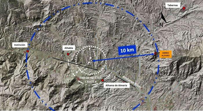 火山口中心的位置和Alhabia-Tabernas盆地中受撞击影响的20公里半径的区域。资料来源:Sánchez-Garrido et al 2022。基础地图:国家地理研究所(IGN)。