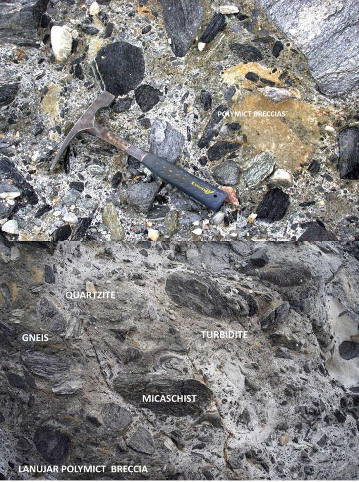 撞击坑的证据包括几个角砾岩中'受冲击'的石英颗粒的例子--角砾岩是一种沉积岩类型,其大块碎片被固结在更精细的基质中。这些颗粒显示出在巨大的撞击压力下变形的迹象,这些压力在10到30千兆帕之间。资料来源:Sánchez-Garrido等人 2022年
