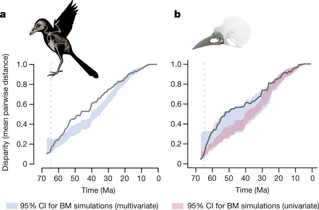 相比之下,陆生鸟类(Inopinaves)在K-Pg之后的早期就演化出独特的、群体特有的身体形态,随后强调局部形状的变化,特别是头部和四肢远端骨骼的变化,这些骨骼与环境的互动更为直接。占所有鸟类物种一半以上的鸟类显示出一种保守的演化动态,导致所有骨骼部分的低差异性。对于一些骨骼部分,包括喙和组合骨骼形态,早期建立活鸟形态空间的证据是明确的。然而,研究人员发现几乎没有证据表明该形态空间的早期划分,这与“生态位填充”的具体预测相反。然而,广泛环境类型之间的早期分化可能引起了演化模式的早期分化,这表明环境分化在构建鸟类总群的辐射中起着重要作用。